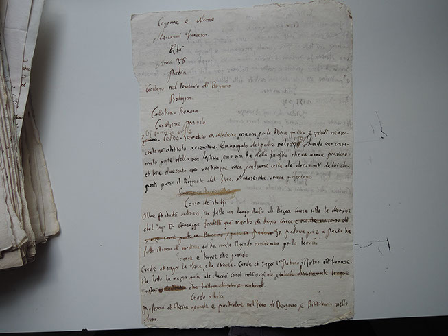 Nato a Gorlago in provincia di Bergamo il 22 luglio 1776, da famiglia da lui stesso definita “civile”, fu avviato agli studi classici e approfondendo in particolare lo studio dei classici greci. All’età di ventuno anni, gli fu assegnata dal padre una rendita annuale che però fu costretto a consumare in gran parte per mantenersi agli studi; frequentò la facoltà di medicina a Padova e a Pavia conseguendo la laurea, senza tuttavia abilitarsi ad esercitare la professione di medico. Nel curriculum redatto di suo pugno nel 1814 – il curriculum è trascritto nell’approfondimento - apprendiamo che, oltre alla lingua italiana, latina e greca, egli conosce anche il francese; afferma inoltre di sapere l’inglese quanto basta per leggere le opere scientifiche.